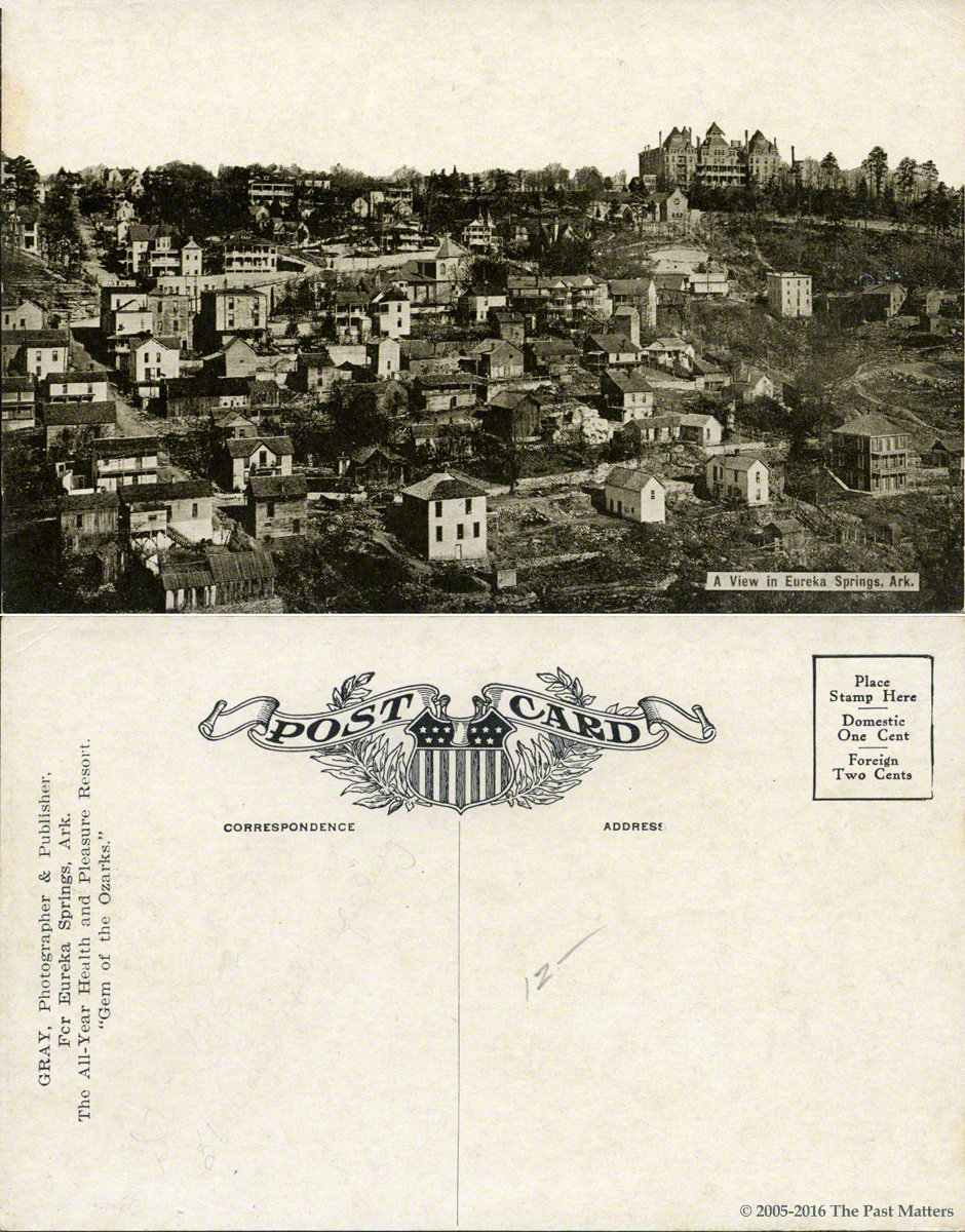 Imprinted on the back with “GRAY, Photographer & Publisher, For Eureka Springs, Ark. The All-Year Health and Pleasure Resort. “Gem of the Ozarks.”