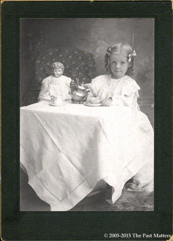 Dating from the 1890s and known as a low-brow china, the doll is also unusual because of her café au lait hair color – most china-head dolls had black hair.